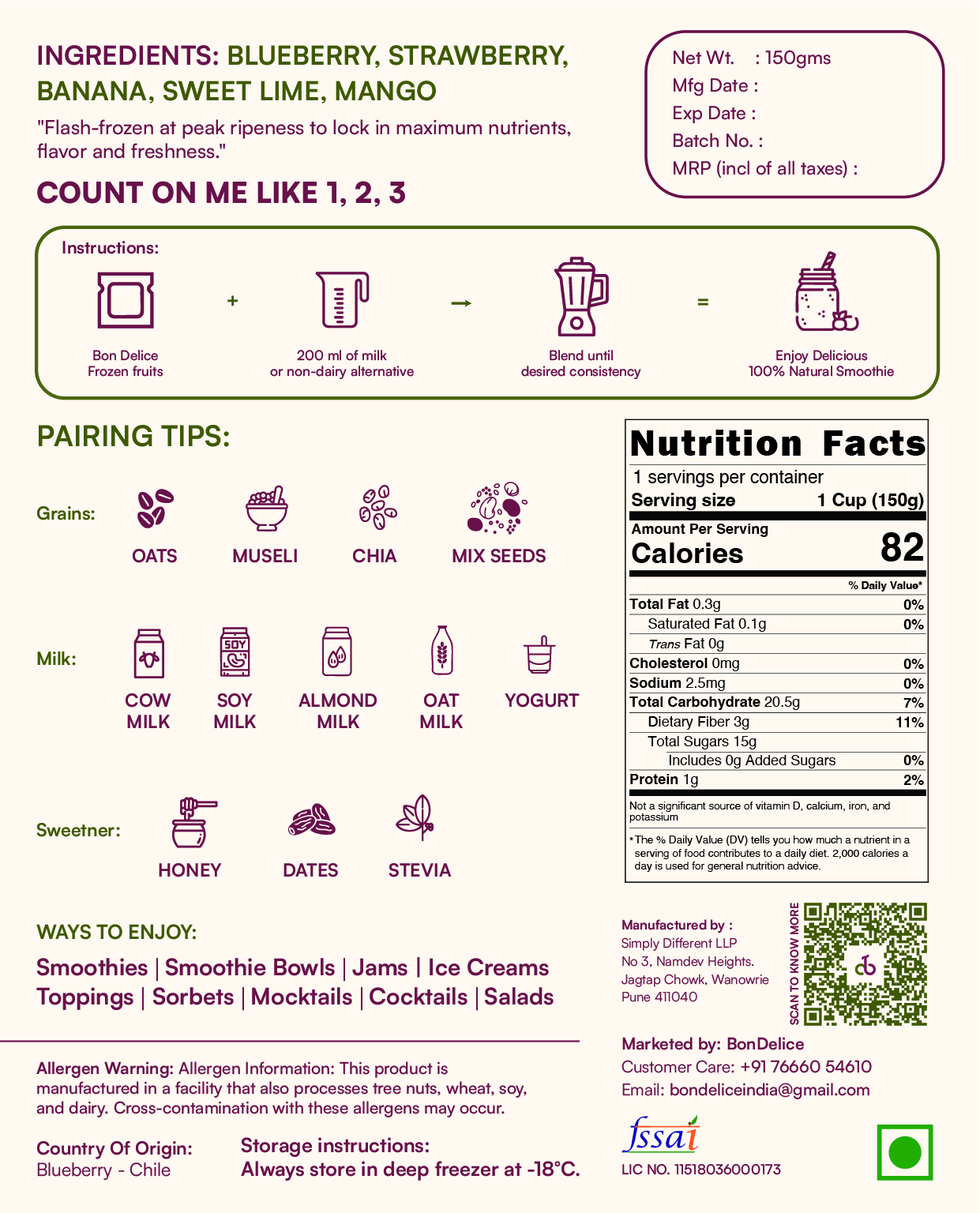 Blueberry. Strawberry. Mango. Banana. Your favorite fruits, frozen at their peak and ready to blend! Sweet, tangy, tropical — this mix is a burst of color and flavor that powers you through your day. No prep, no mess — just blend, sip, and feel amazing!
